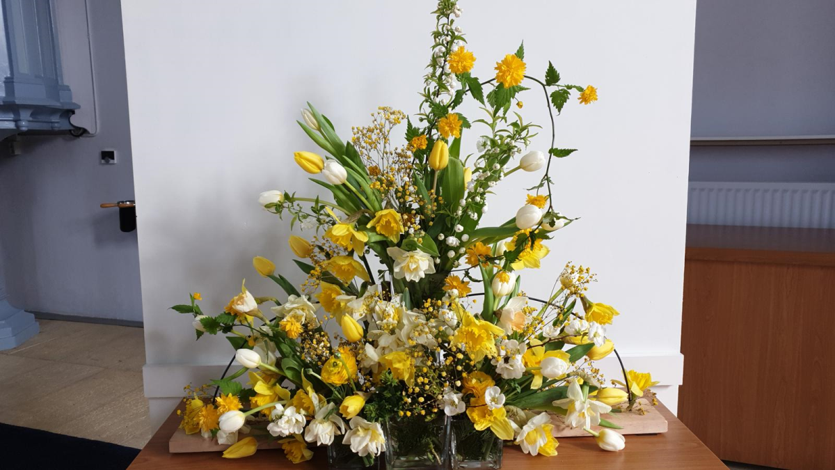 Op de paasochtend zagen Maria, Petrus en Johannes dat het graf leeg was. Jezus is opgestaan uit de dood. Halleluja. Na de ontmoeting tussen Maria en Jezus kwam Hij bij de leerlingen en zei: ‘Ik wens jullie vrede. Zoals de Vader mij gezonden heeft, zo zend ik jullie uit.’ Na deze woorden gaf Hij de heilige Geest door aan zijn leerlingen. Ook vandaag inspireert de Geest ons om op weg te gaan met het evangelie. We mogen erop vertrouwen dat de Geest de kerk brengt waar mensen zijn, midden in het leven. De schikking is als een feest: met narcissen die als het ware het nieuwe leven belichamen en symbool zijn van de lente.